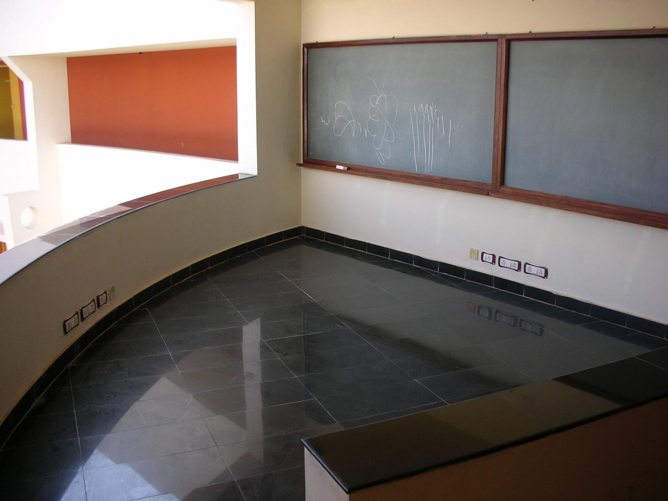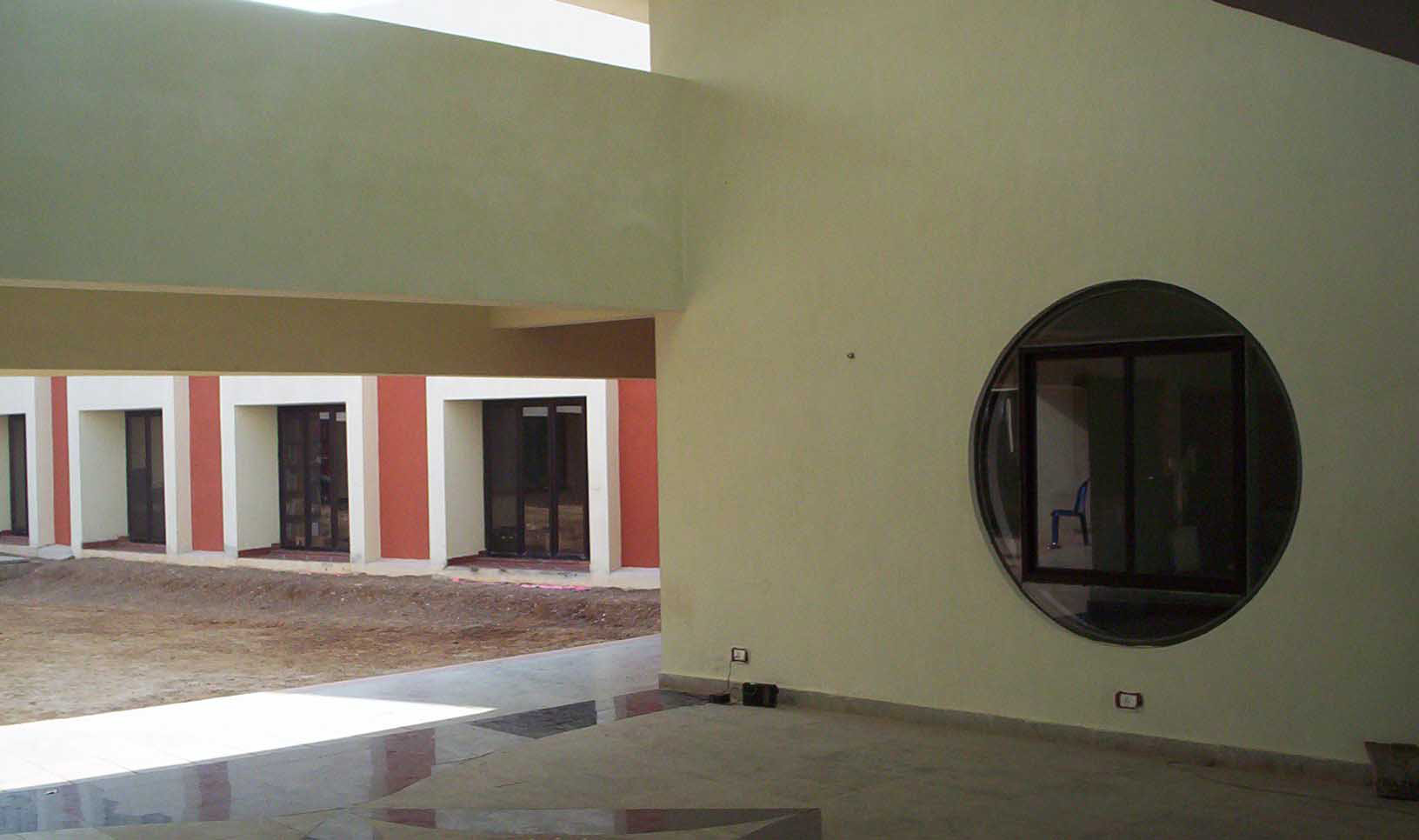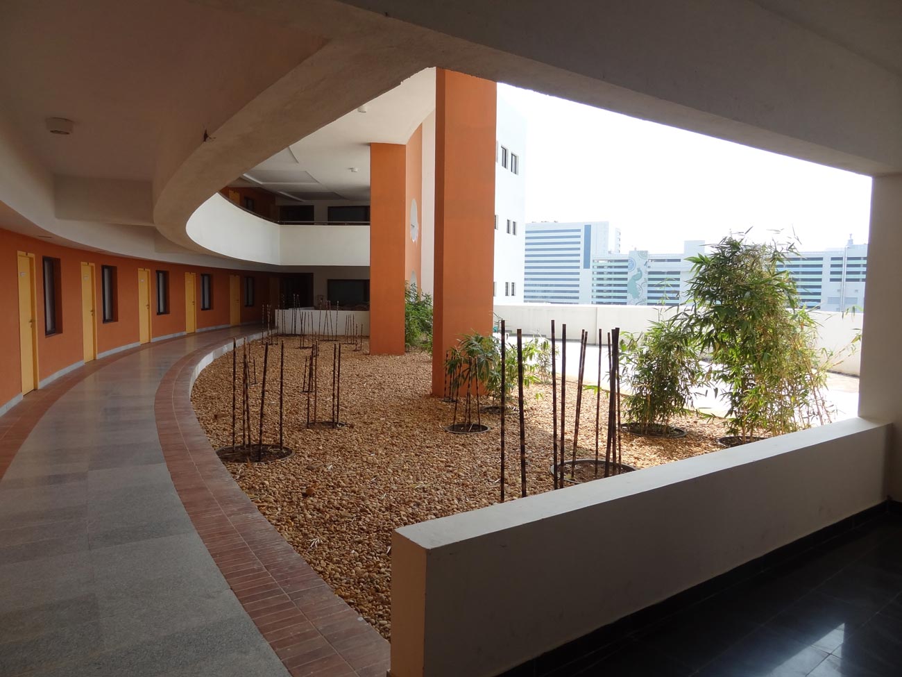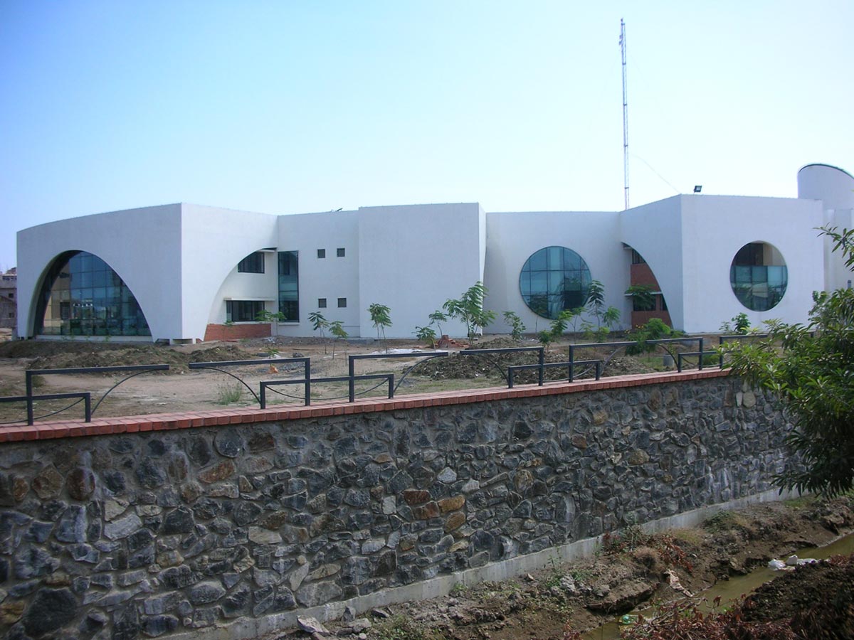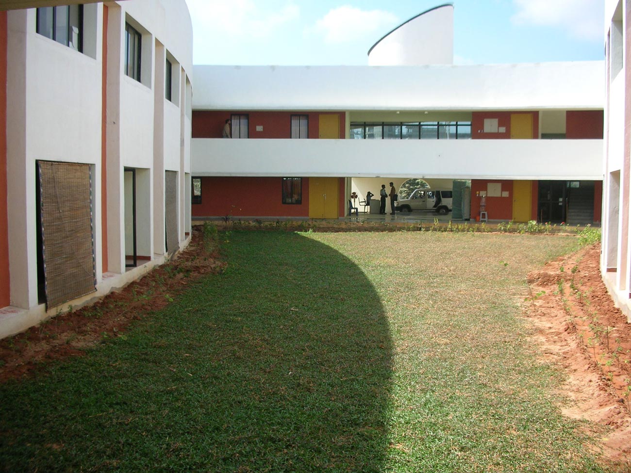 The design integrates and interweaves the indoors and outdoors creating a stimulating and enabling spatial experience. All the facilities are designed to be single room deep with adequate openings to capture indirect light and allow cross ventilation. The open corridors lining the courts provide access to the facilities besides offering a setting for interaction. Discussion areas with blackboards are provided at focal points of the corridors for informal exchange and study