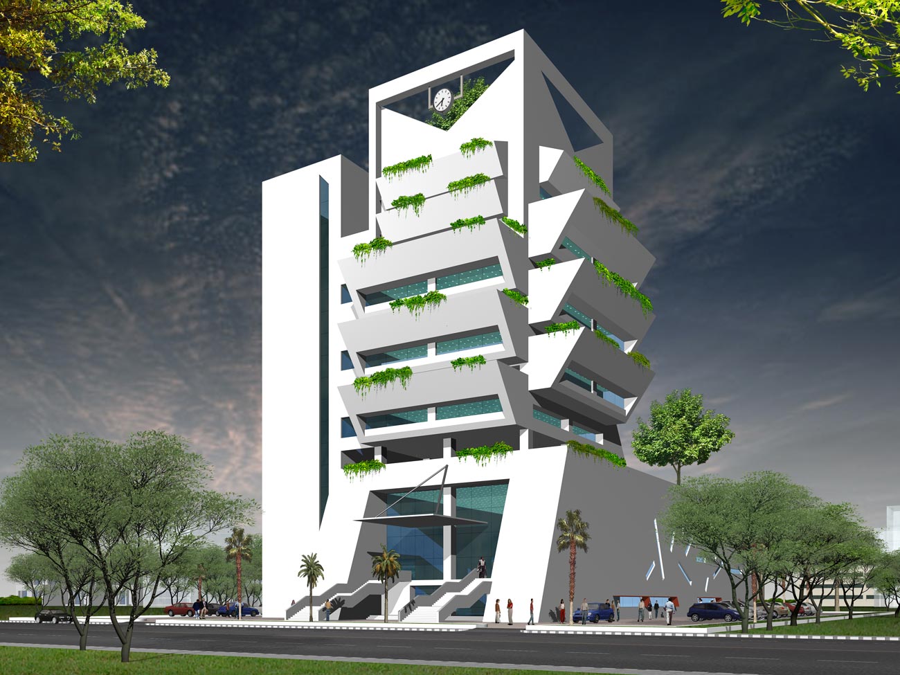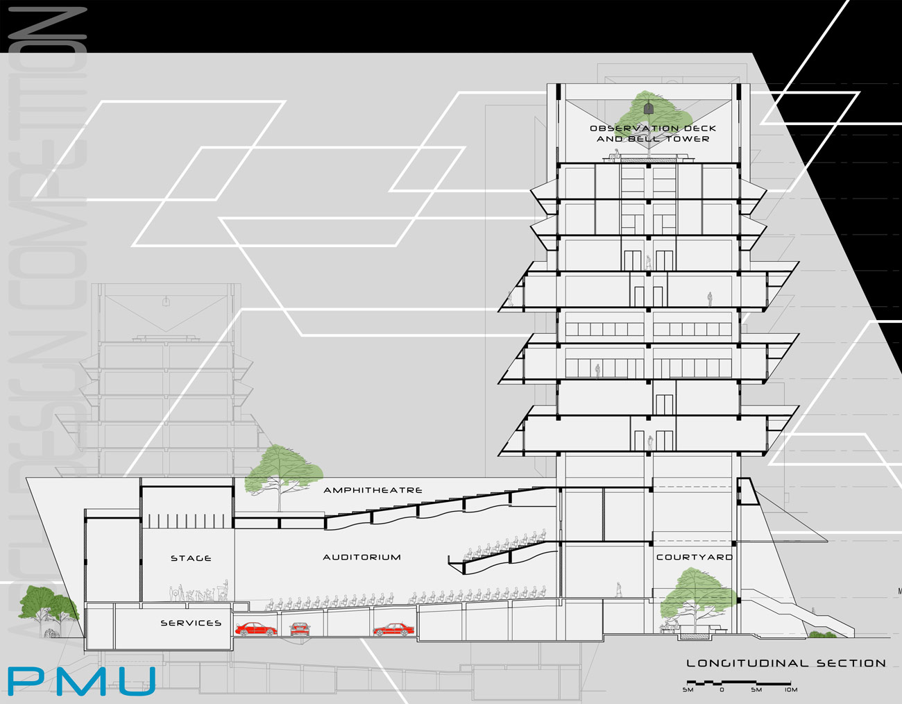 A national competition winning entry for a multi-storied administrative block and auditorium for a major university in Tanjore , the design strives to create an interesting vertical form serving like a signpost for the sprawling low rise campus. The lower floors housing a 1000 seater auditorium forms a podium like base for a slender office tower with staggered cantilevered landscaped floors creating a staggered profile. The design provides for three community zones to augment the sense of belonging. An amphitheatre on the roof of the auditorium , an open terrace cafeteria at the second floor level